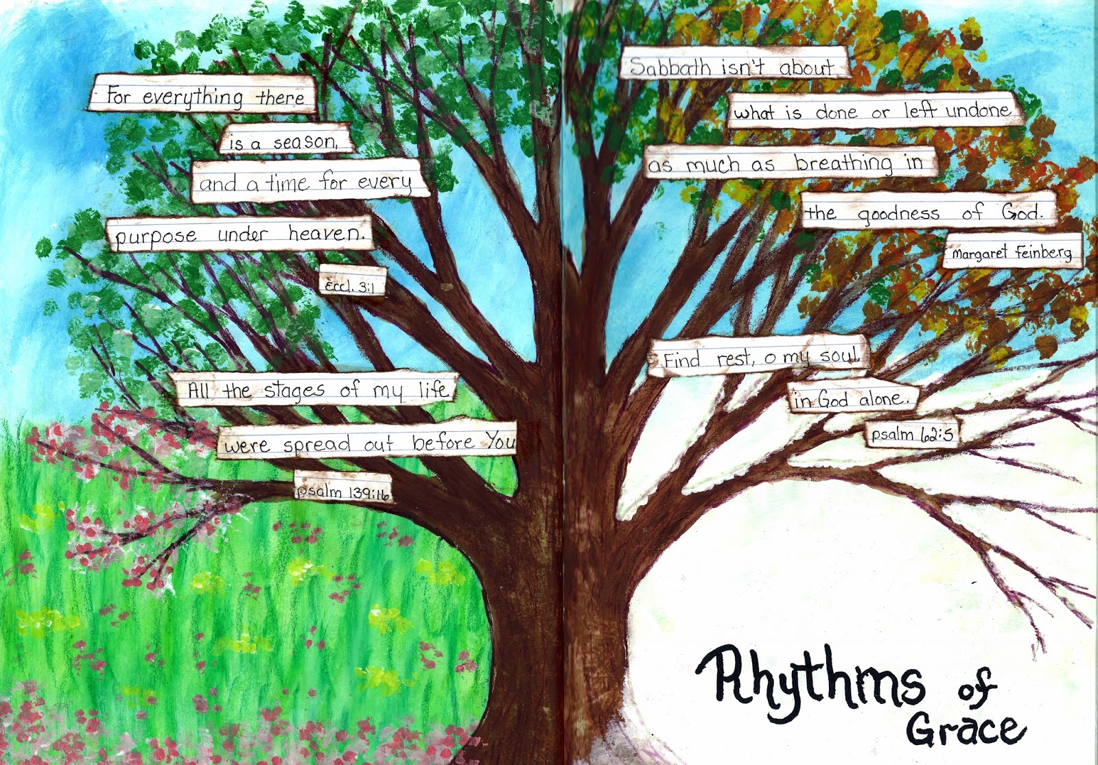 Week 4: Rhythms of Grace. I had in mind a 4 seasons tree when I studied this lesson. I think each day has its season/rhythm and each part is important, you wake to a fresh new day/spring, you are productive through the day and gradually slowing down toward evening, and end with rest/winter. I found a quote that I love by Margaret Feinberg, "Sabbath isn't about what is done or left undone as much as breathing in the goodness of God. :) This page is done with gesso, gelatos, watercolor crayons and acrylic paints. (The scan shows the winter quarter so much brighter than the actual page.)